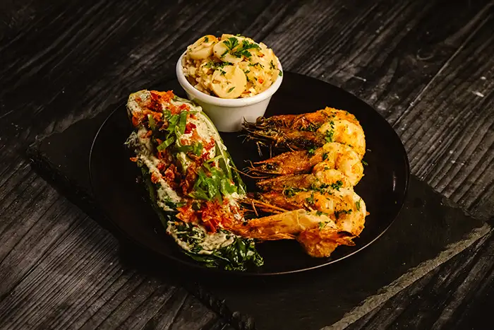 Garlic shrimp, heart of palm rice, vegetablesPollo Tree House