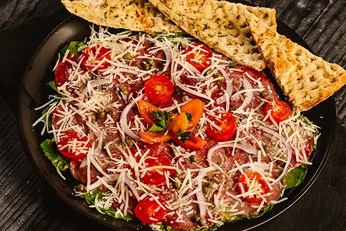 Beef carpaccio, focaccia, rucula, parmesan, alcaparras