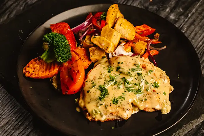 Chicken breast fillet, house creamy sauce, potatoes, fresh vegetablesCostilla de Cerdo BBQ